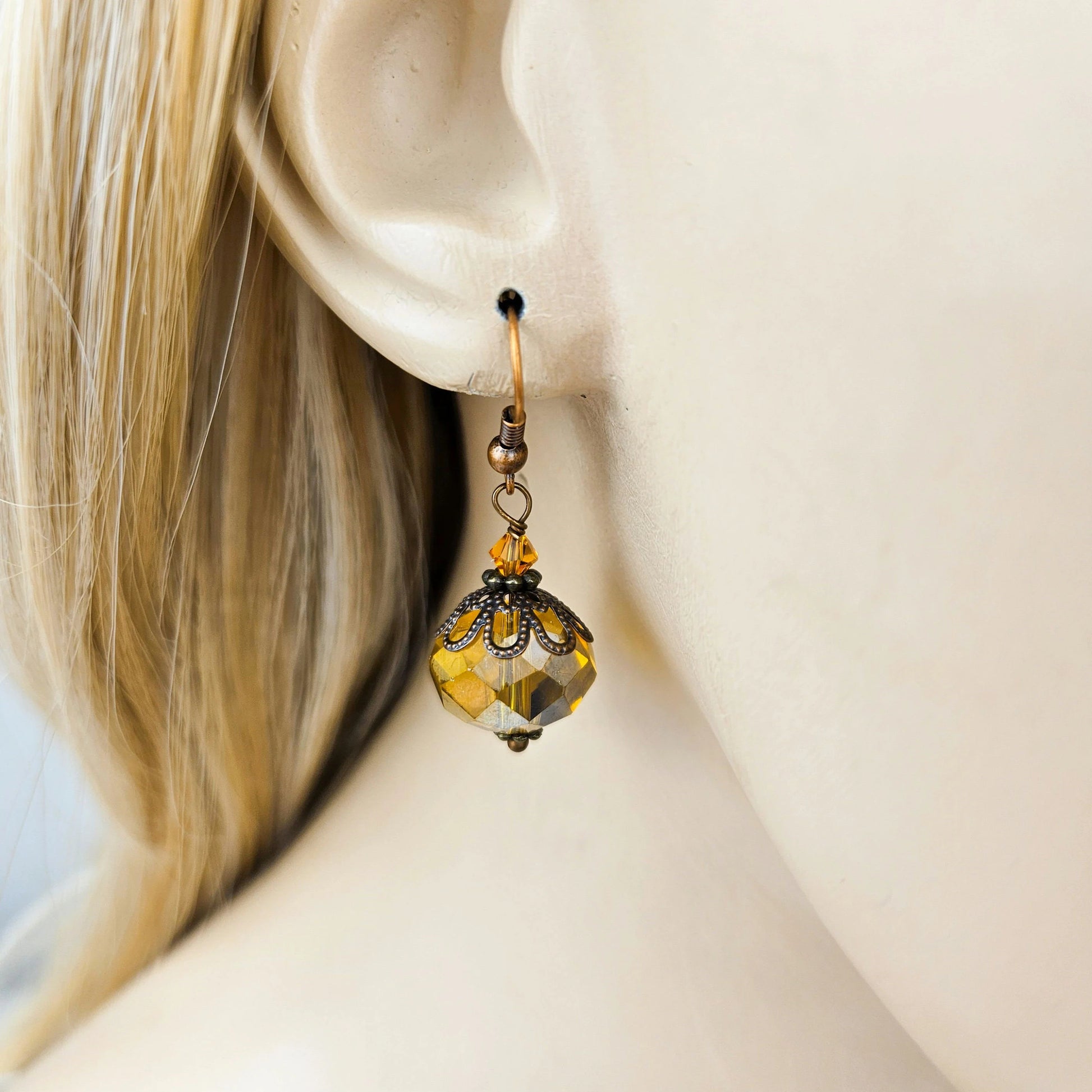 Bring warmth and vintage charm to your look with these amber-topaz glass earrings. The faceted glass beads shimmer in golden honey tones, wrapped in antique copper filigree for a timeless, old-world feel. Lightweight and versatile, these earrings are perfect for fall outfits, rustic weddings, bohemian festivals or as a thoughtful November birthstone gift.