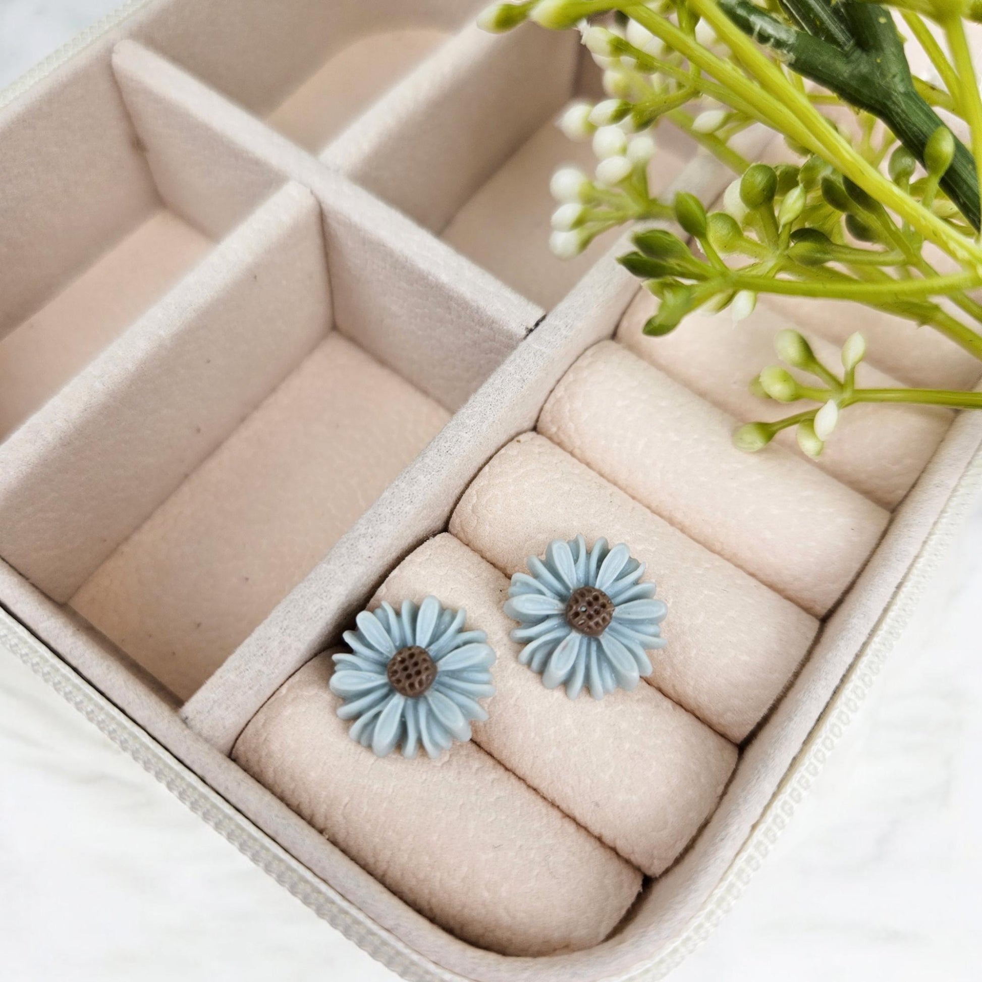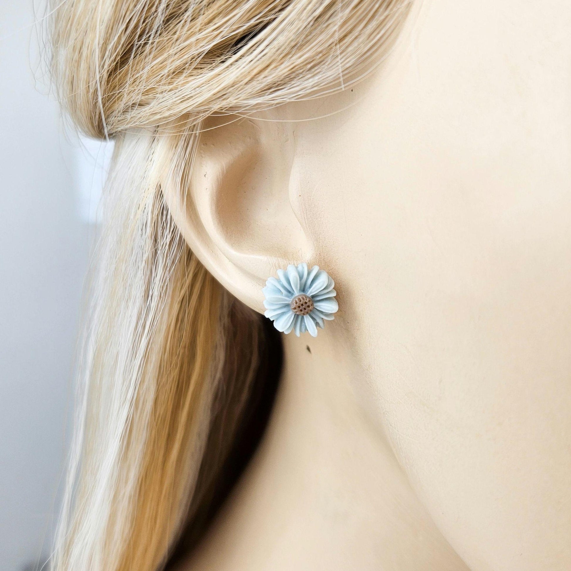 Blue daisy stud earrings are a sweet and feminine accessory that add a touch of floral charm to any outfit. Made from high-quality resin, these daisy earrings feature delicate light blue petals with a soft brown center, secured on silver-tone posts for comfortable everyday wear. Their lightweight design makes them perfect for daily use while still standing out as a unique floral jewelry piece.
