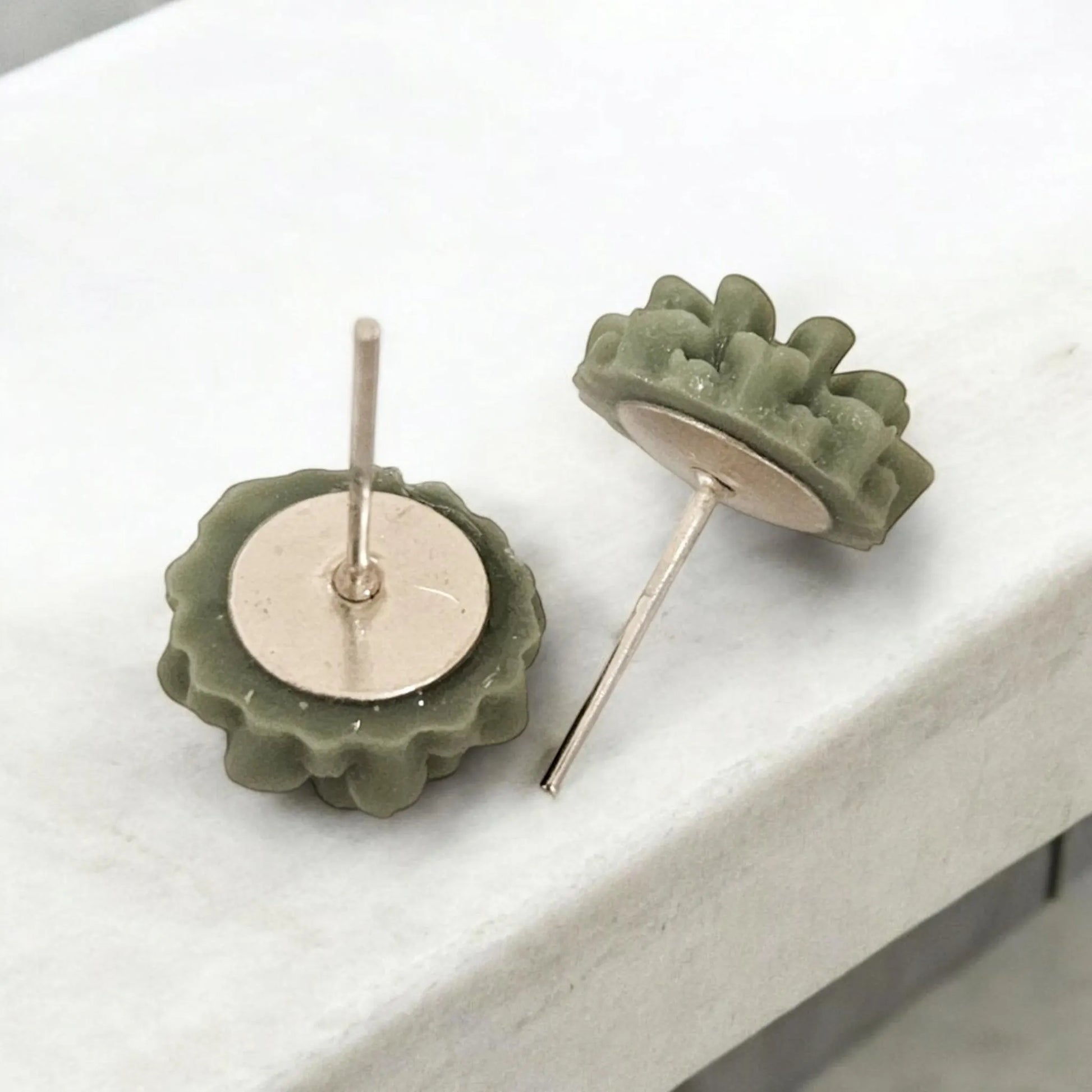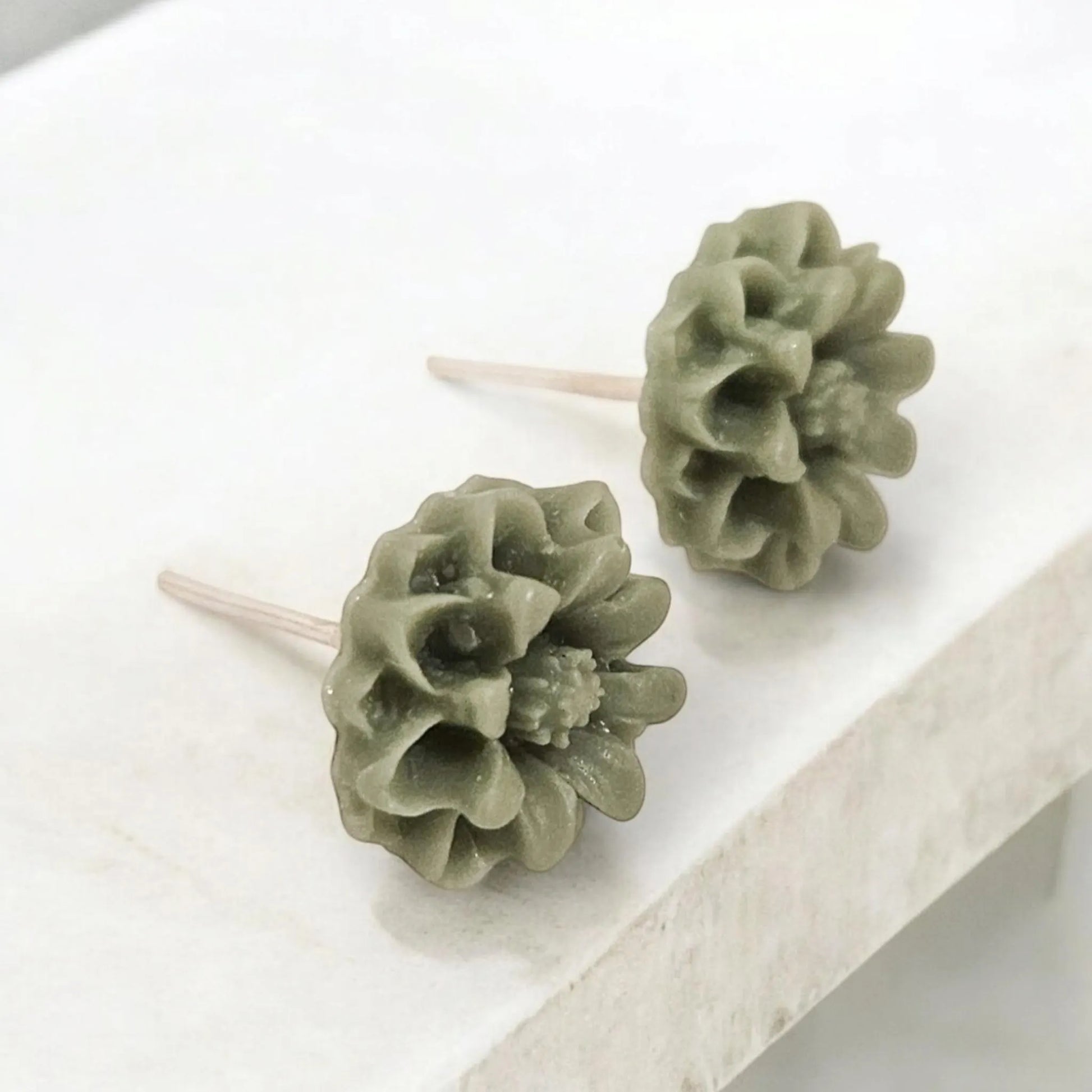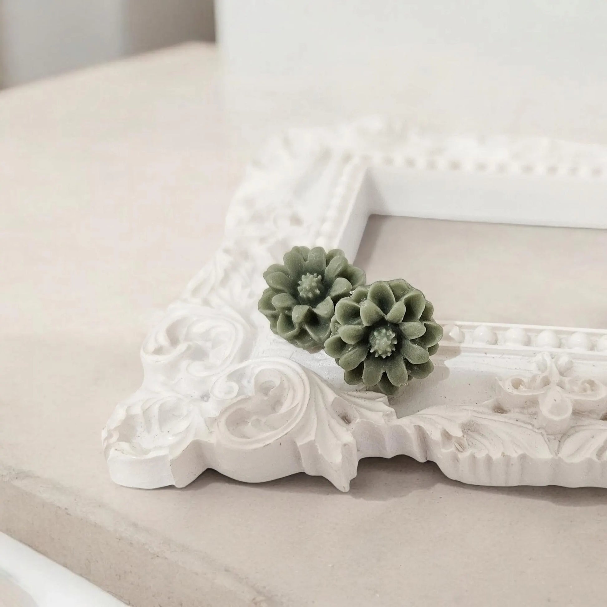 These handmade green resin stud earrings feature delicate mum cabochons set on silver-plated posts. Lightweight and comfortable, they are perfect for treating yourself to a versatile everyday accessory or gifting to someone special for birthdays, weddings or other occasions.